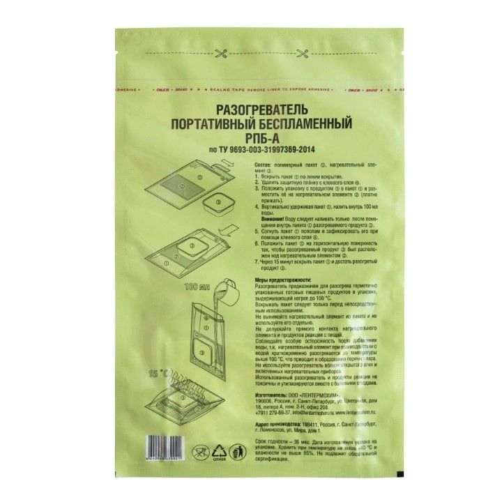 6. Использованный нагревательный элемент вынуть из пакета и утилизировать с бытовыми отходами. Остаток воды, после подогрева, не использовать для питья.