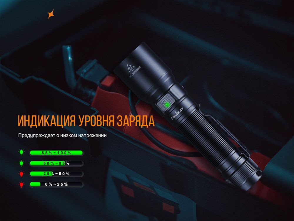 Комплектация: фонарь модели Fenix C6V3.0, ARB-L18-2600 Li-ion аккумулятор, USB Type-C кабель зарядки, ремешок на руку, уплотнительное кольцо, инструкция к применению, карточка гарантии.