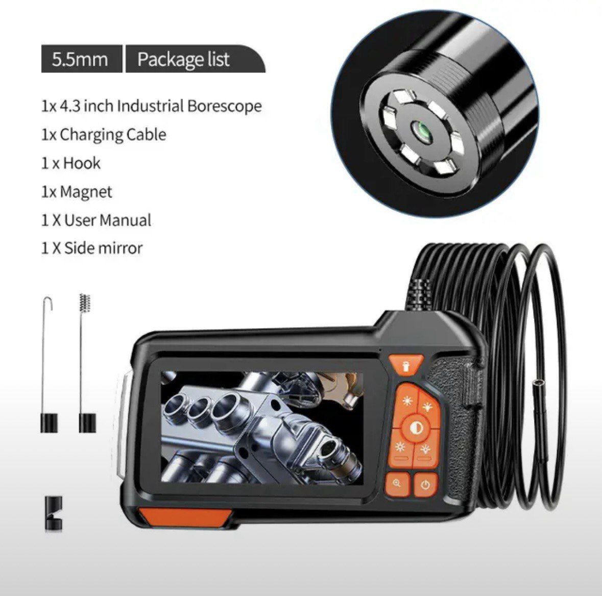 Водонепроницаемая эндоскопическая камера IP67 с магнитным наконечником, боковым зеркалом и крючком, выдерживает погружение на глубину до 1 метра на срок до 60 минут. 8 светодиодов помогут вам работать в темноте. Нескользящий матовый корпус делает камеру удобным.