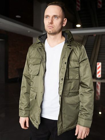 Современная и практичная куртка в стиле милитари прекрасно подойдет как для активного отдыха, так и для повседневной жизни. Верх выполнен из нейлона с влагостойкой пропиткой. Подкладка из полиэстера. Застегивается на молнию с клапаном на кнопках. В нижней части расположены два прорезных кармана и два кармана с клапаном на кнопке. На груди имеются два накладных кармана с клапаном. С внутренней стороны слева расположен один прорезной карман. Манжеты на кнопках. Есть утяжка на капюшоне и кулиска в районе талии.