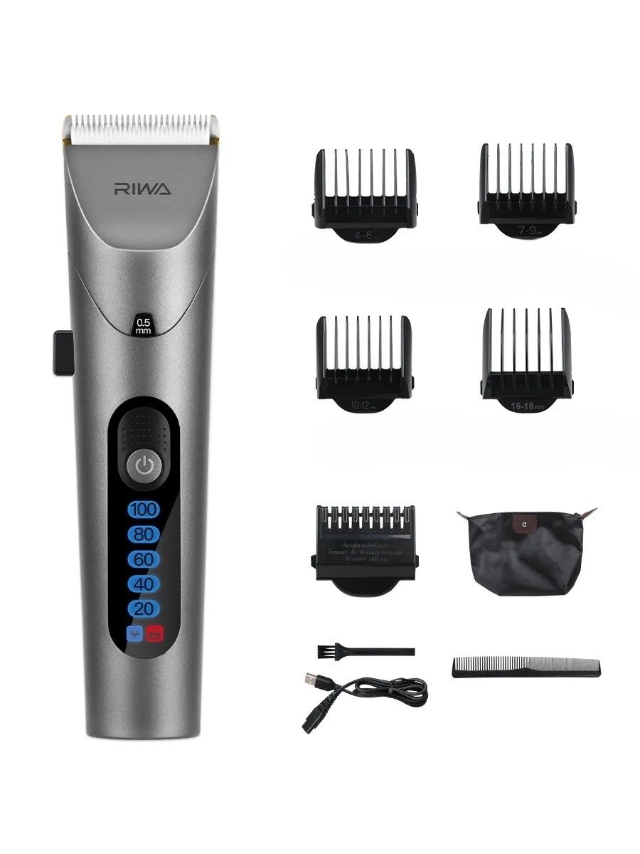 Ручной портативный триммер riwa RE-6305, с помощью которого можно ухаживать за прической дома и не тратить время на походы в парикмахерскую. В наборе: машинка для стрижки волос, фланелевая сумка, USB-кабель для зарядки, съемные регулируемые насадки, щетка для очистки. Эта модель имеет экран с индикатором количества заряда. Мощный девайс для бритья и стрижки с низким уровнем шума и закругленными лезвиями подходит мужчинам для ухода, полировки, подравнивания секущихся концов. Недорогой аксессуар хорош для создания тонких ровных контуров, детской гравировки, top trend фэйд. Универсальные элементы идеальны для подростков, маленьких детей. Многофункциональный электронный прибор - качественная бытовая техника для стрижки кончиков волос. Беспроводная электромашинка гаджет для стрижки лучше проводной, т.к. компактный размер и автономная работа от батареи без перерыва на подзарядку позволяет брать её с собой в поездки, как бритву для висков, окантовки волос, щетины, усов и бакенбардов, укладки бороды. Китайская электробритва для настоящих стилистов, чтобы гладко стричь и брить одним нажатием на кнопку. Этот электронный аппарат способствует точности и аккуратности барбера в барбершопах. Такой инструмент заменит: обычный станок, резак, мини шейвер с керамическими ножами. RIWA RE-6305 считается лучшей бюджетной моделью и представляет собой недорогую и высококачественную машинку для стрижки волос.