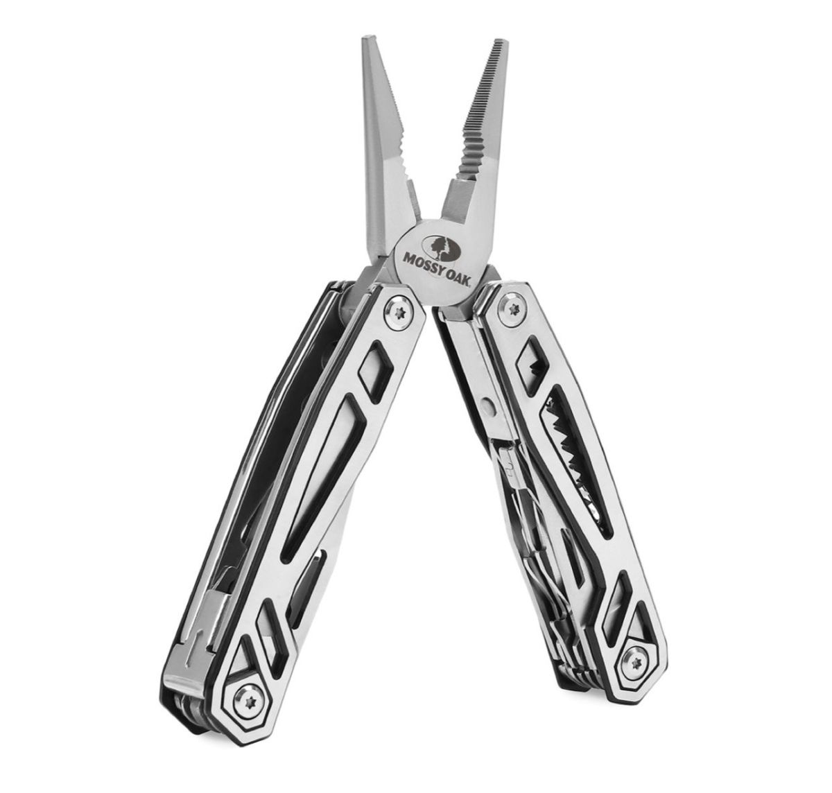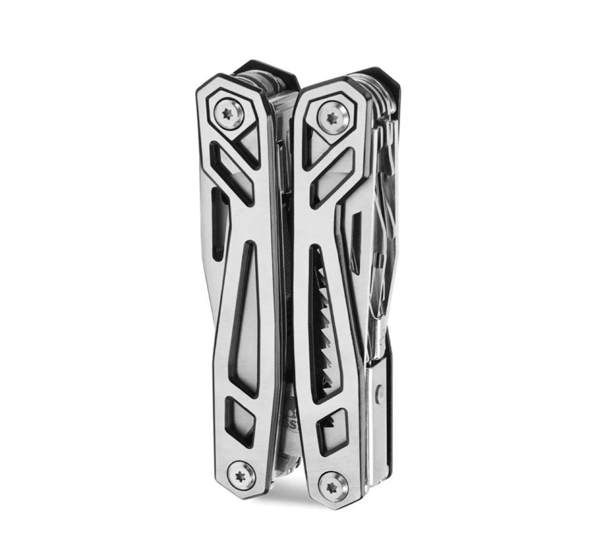 Мультитул выполнен в стиле скелетон, сделан из нержавеющей стали.