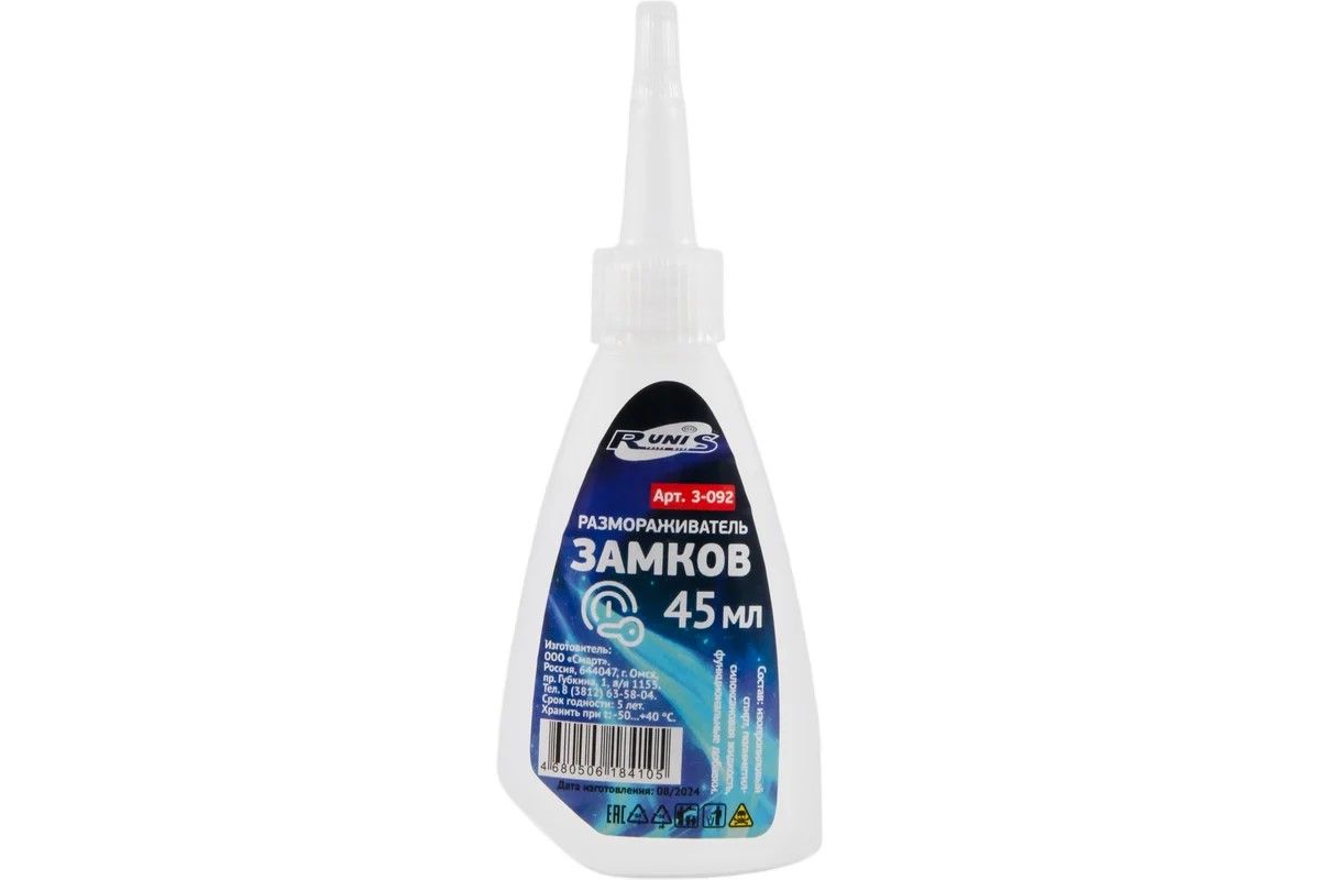 Специальный состав Runis 3-092 послужит в зимнее время. При нанесении средства в замочную скважину, размораживатель воздействует на кристаллы льда и разрушает их структуру